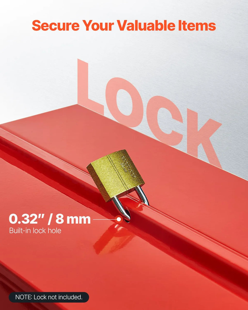 Uzlabota drošība: Izvelkamajai instrumentu kastei ir iebūvēts aizslēga cauruma dizains augšpusē, kas ļauj pievienot slēdzeni papildu drošībai. Tas palīdz aizsargāt vērtīgus priekšmetus un novērš zādzības. (Piezīme: aizslēga caurums ir piemērots 8 mm slēdzenei, kura nav iekļauta komplektā.)