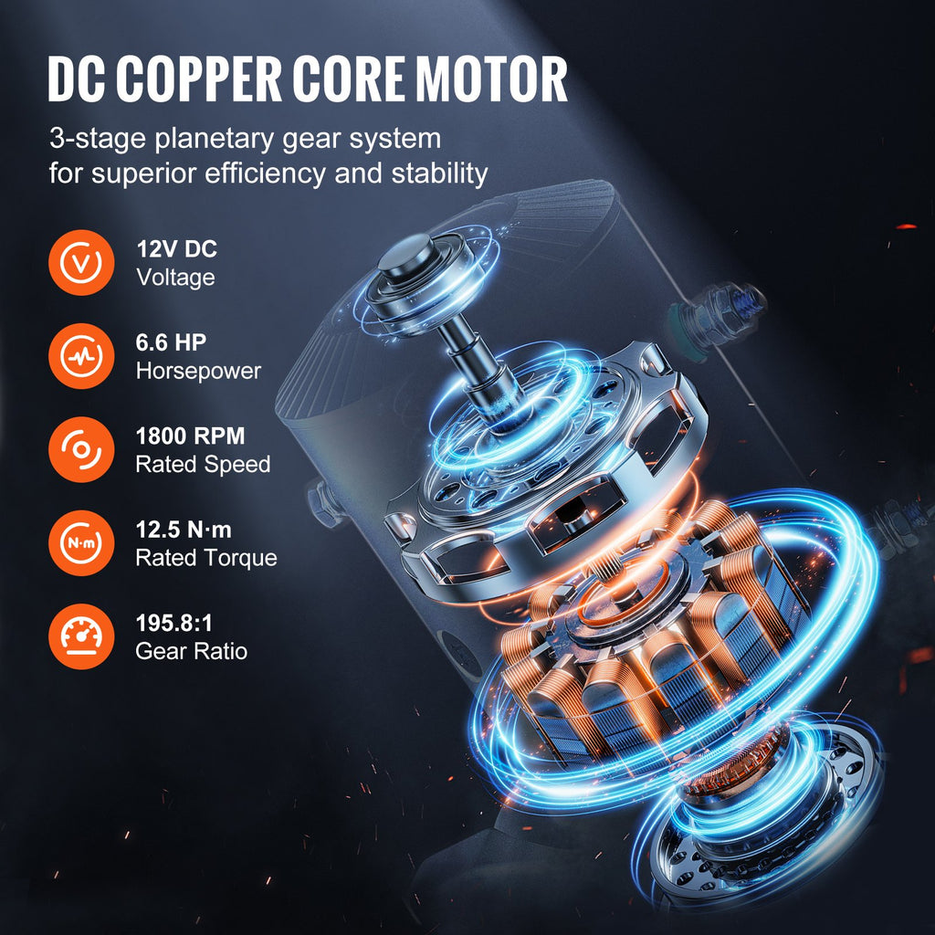 Šī kravas automobiļa vinča ir aprīkota ar 12V DC/6.6 ZS tīra vara motoru, kas nodrošina stabilu un efektīvu jaudu pat vissmagākajos apstākļos. Uzlabotā 3 pakāpju planetārā pārnesumu sistēma un 195,8:1 pārnesuma attiecība garantē spēcīgu vilkšanas spēku, nodrošinot uzticamu veiktspēju pat dziļos dubļos un sarežģītos laikapstākļos.
