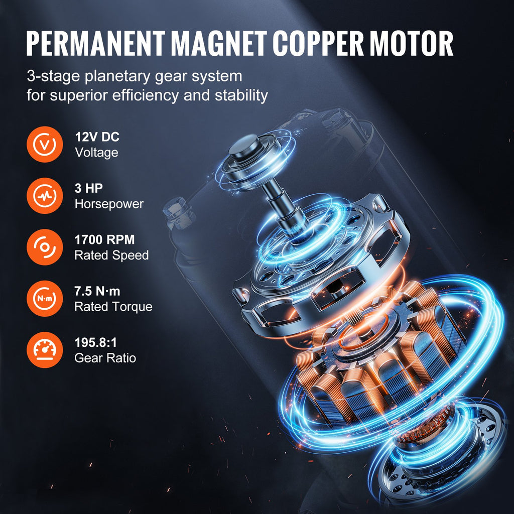 Šī kravas automobiļa vinča ir aprīkota ar jaudīgu 12V DC/3 ZS pastāvīgā magnēta vara motoru, kas nodrošina stabilu un efektīvu jaudu pat vissmagākajos apstākļos. Uzlabotā 3 pakāpju planetārā pārnesumu sistēma un 195,8:1 pārnesuma attiecība garantē spēcīgu vilkšanas spēku, nodrošinot uzticamu veiktspēju pat dziļos dubļos un skarbos laikapstākļos.