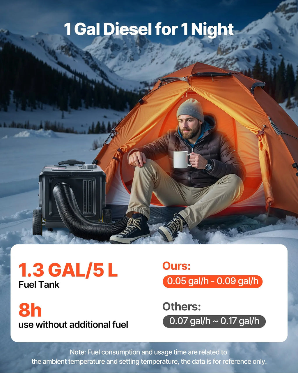 Fuel Efficient: Portatīvais dīzeļsildītājs ir aprīkots ar klusu, energoefektīvu degvielas sūkni un patērē 0,19–0,34 L/h ar vairāk nekā 90% lietderību. 5 L degvielas tvertne nodrošina apkuri visas nakts garumā bez papildu uzpildes, samazinot degvielas patēriņu un enerģijas zudumus.