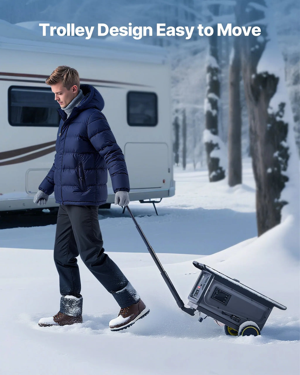 Fast Heating: Mūsu 8 kW dīzeļsildītājs apsilda 20–25 m² lielas telpas, 5 minūtēs sasniedzot līdz 99 °C un nodrošinot komfortablu salona temperatūru aptuveni 10 minūtēs. Darbojas ar 12V strāvu vai 220V pieslēgumu. Izvelkamais rokturis atvieglo pārvietošanu.