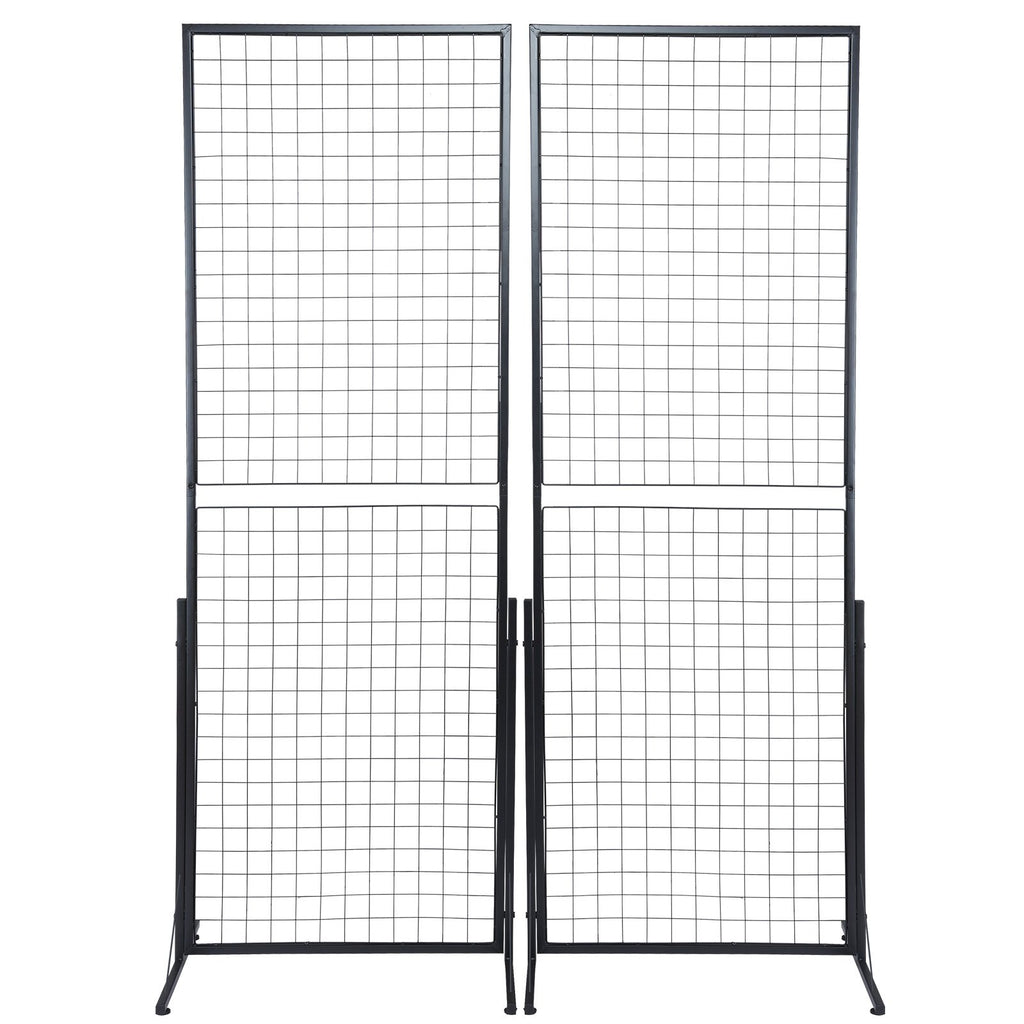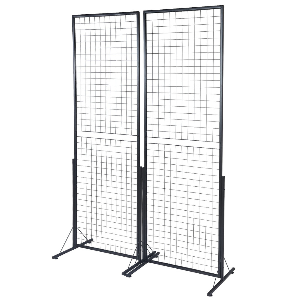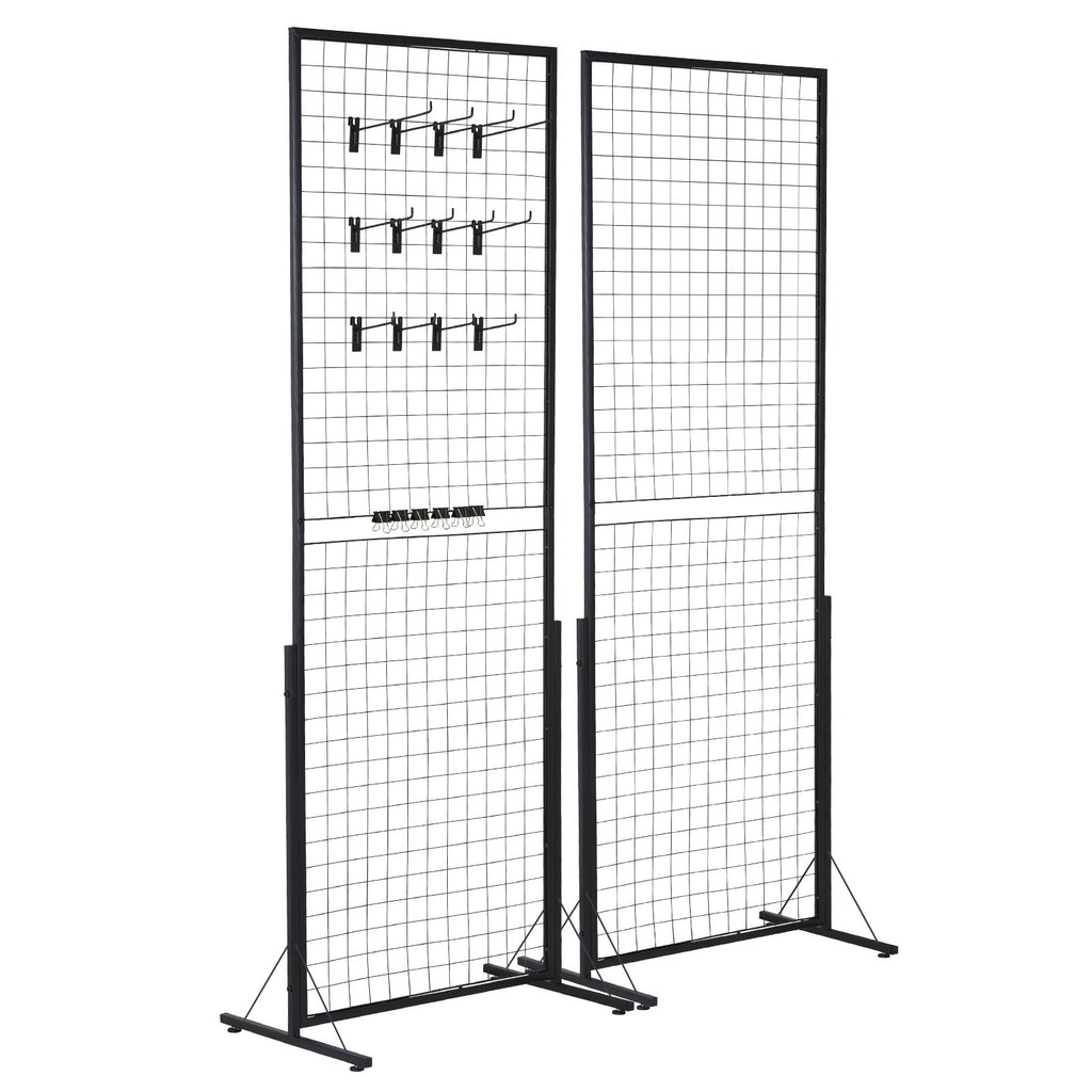 Komplektā ietilpst divi režģa stendi ar izmēriem 61,7 × 171,6 cm, nodrošinot plašu vietu priekšmetu iekāršanai gan mājas interjeram, gan komerciāliem izkārtojumiem. Unikālais salokāmais dizains ļauj tos viegli uzstādīt un kompakti uzglabāt – ideāli piemēroti vidēm, kur nepieciešamas biežas ekspozīcijas maiņas.