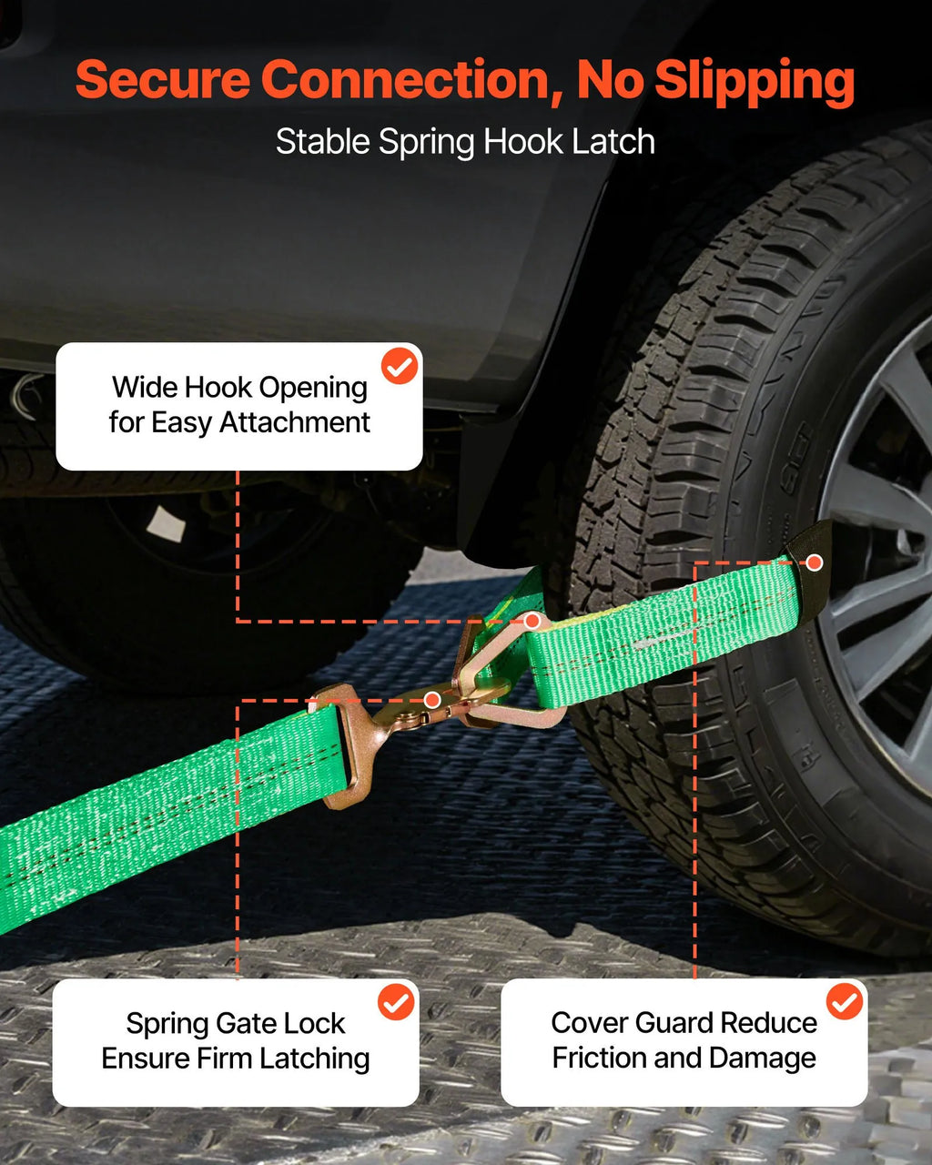 Uz asi orientēts dizains nodrošina, ka transportēšanas laikā netiek bojātas riepas vai diski. Automašīnas nostiprināšanas komplektā ietilpst sprūdrata siksnas ar atsperu āķiem 2438,4 mm garumā, kā arī četri 914,4 mm un četri 609,6 mm asi aptveroši siksnu komplekti, kas nodrošina drošu un efektīvu kravu nostiprināšanu kravas automašīnām, SUV un klasiskajiem auto.