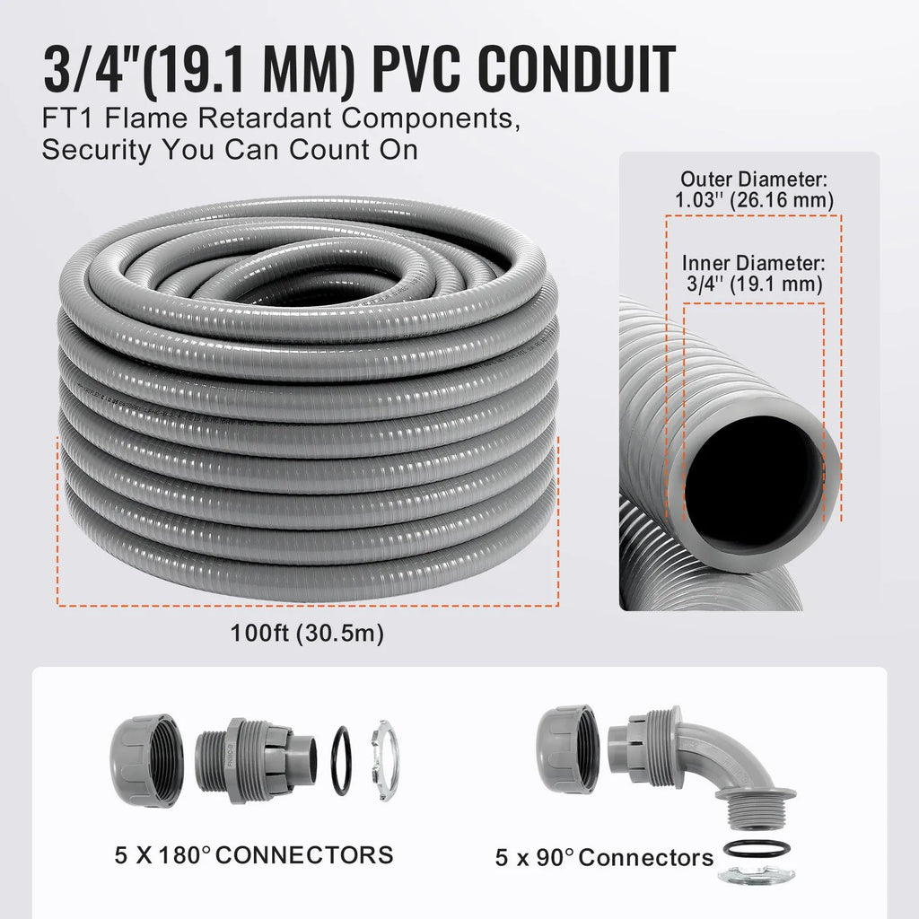 Caurulei ir IP65 aizsardzības klase, kas nozīmē augstu aizsardzību pret putekļiem un ūdeni. Tas nodrošina jūsu elektroinstalācijas sistēmas drošību āra apstākļos. Caurule spēj izturēt ārējās ietekmes, nebojājoties, un ir lieliski piemērota tādiem lietojumiem kā āra apgaismojums vai gaisa kondicionēšanas sistēmas. IP65 klase garantē, ka VEVOR caurule būs uzticama izvēle jebkuram āra elektroinstalācijas projektam.