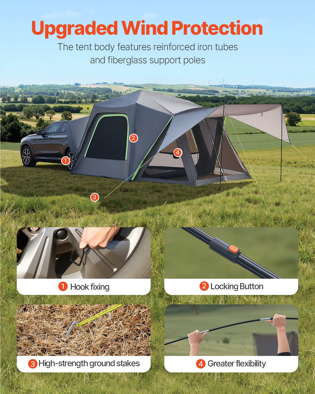 Divu mērķu dizains: Šī daudzfunkcionālā aizmugures telts var tikt pieslēgta pie jūsu transportlīdzekļa, nodrošinot plašu komfortu, vai izmantota kā patstāvīga telts. Tā ir saderīga ar lielāko daļu vidēja lieluma un mazu SUV, ja bagāžnieka vāks paceļas uz augšu un pakaļējais perimetrs nepārsniedz 6,5 m.