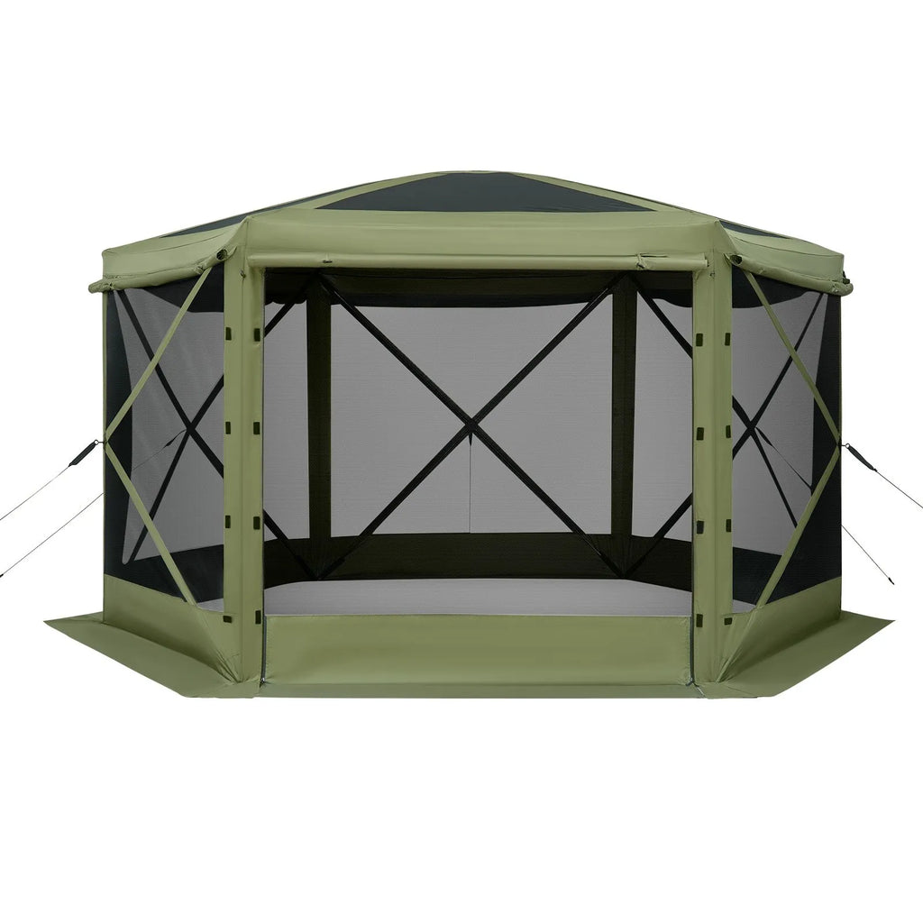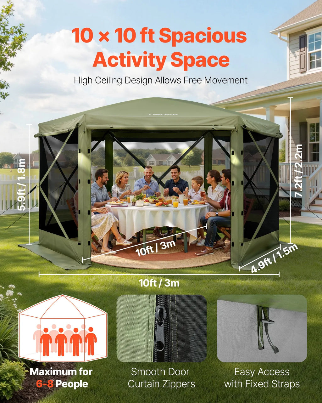 Plaša telpa 8 personām: Šī 3,05 × 3,05 m uznirstošā lapenes sieta telts ērti ietilpina 4 sēdošas personas ar mēbelēm un līdz 6–8 personām aktivitātēm. 2,19 m augstais jumts nodrošina ērtu pārvietošanos iekšpusē. Rāvējslēdzēja un piesienamie durvju paneļi nodrošina ērtu ieeju un izeju. Ideāli piemērota ģimenes saietiem, ballītēm un kempingam