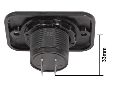 Voltmetrs 6–33 V, Ø37 mm, LED displejs, montāžas atvere 29 mm, montāžas panelis 45×63 mm, skrūvju attālums 48 mm, savienotāji 2×6,3 mm