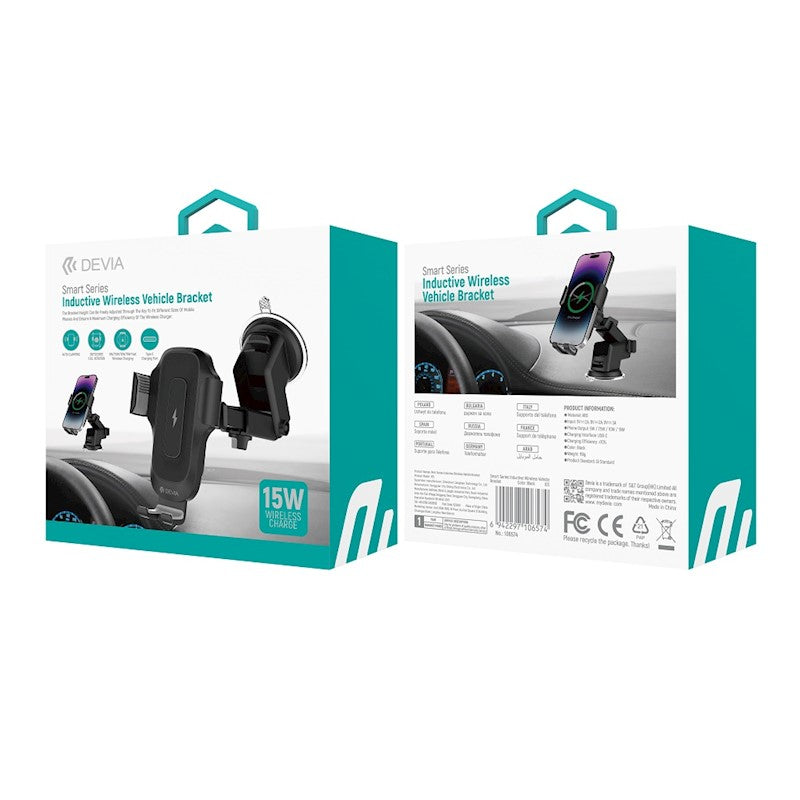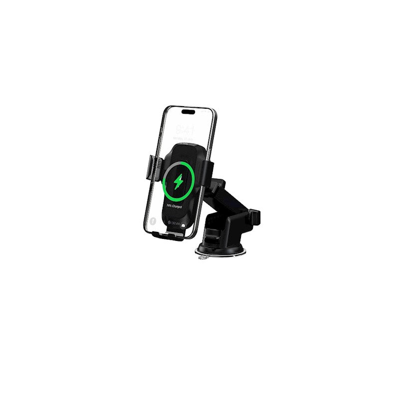Devia automašīnas turētājs ar 15 W bezvadu lādētāju, piesūceknis, melns