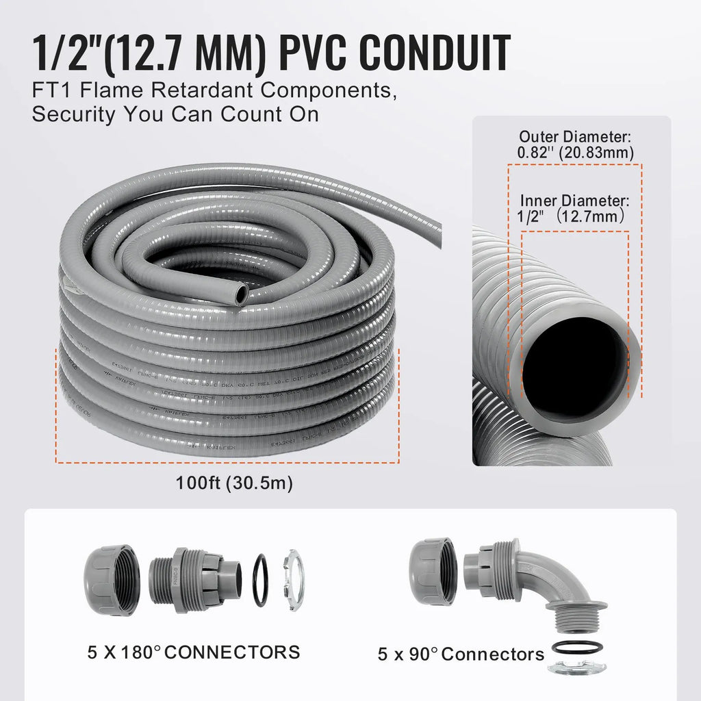 VEVOR caurulei ir pievienoti pieci taisnie un pieci 90 grādu savienotāji. Šie savienotāji padara uzstādīšanu ātru un ērtu. Cauruli var viegli savienot dažādās konfigurācijās, nodrošinot ciešu un drošu savienojumu. Komplektācijā iekļautās gumijas O-veida blīves nodrošina hermētiskumu, pasargājot elektroinstalāciju no mitruma. Nav nepieciešams atsevišķi iegādāties papildu savienotājus.