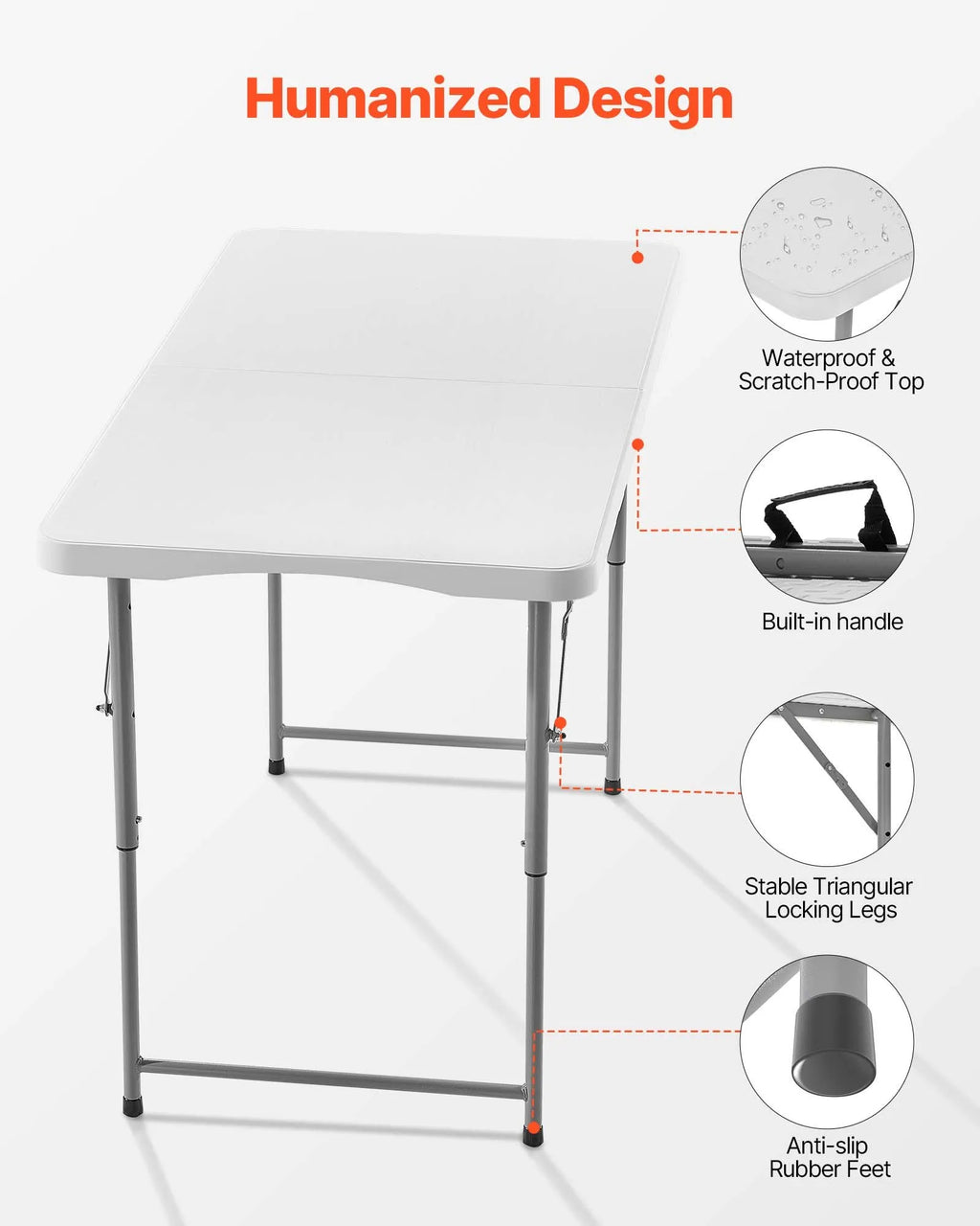 Saliekamais galds, 122 cm, izturīgs pārnēsājams plastmasas taisnstūra galds ar regulējamu augstumu un rokturi, piemērots lietošanai telpās un ārā – svinībām, ēdienreizēm, piknikiem, kempingam, balts