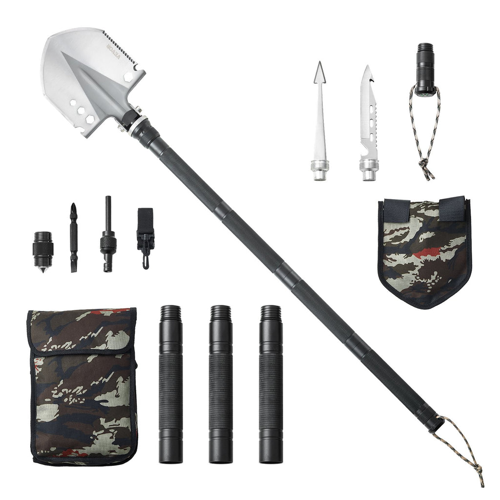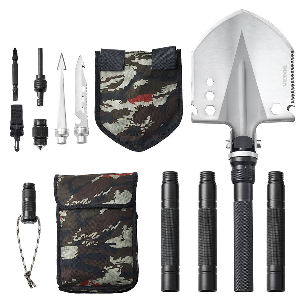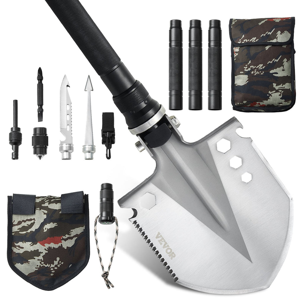 VEVOR 13-in-1 Kempinga Saliekmo Izdzīvošanas Instrumentu Komplekts: lāpsta, nazis, kompass, svilpe, stikla izsistējs, uguns iekurinātājs u.c.