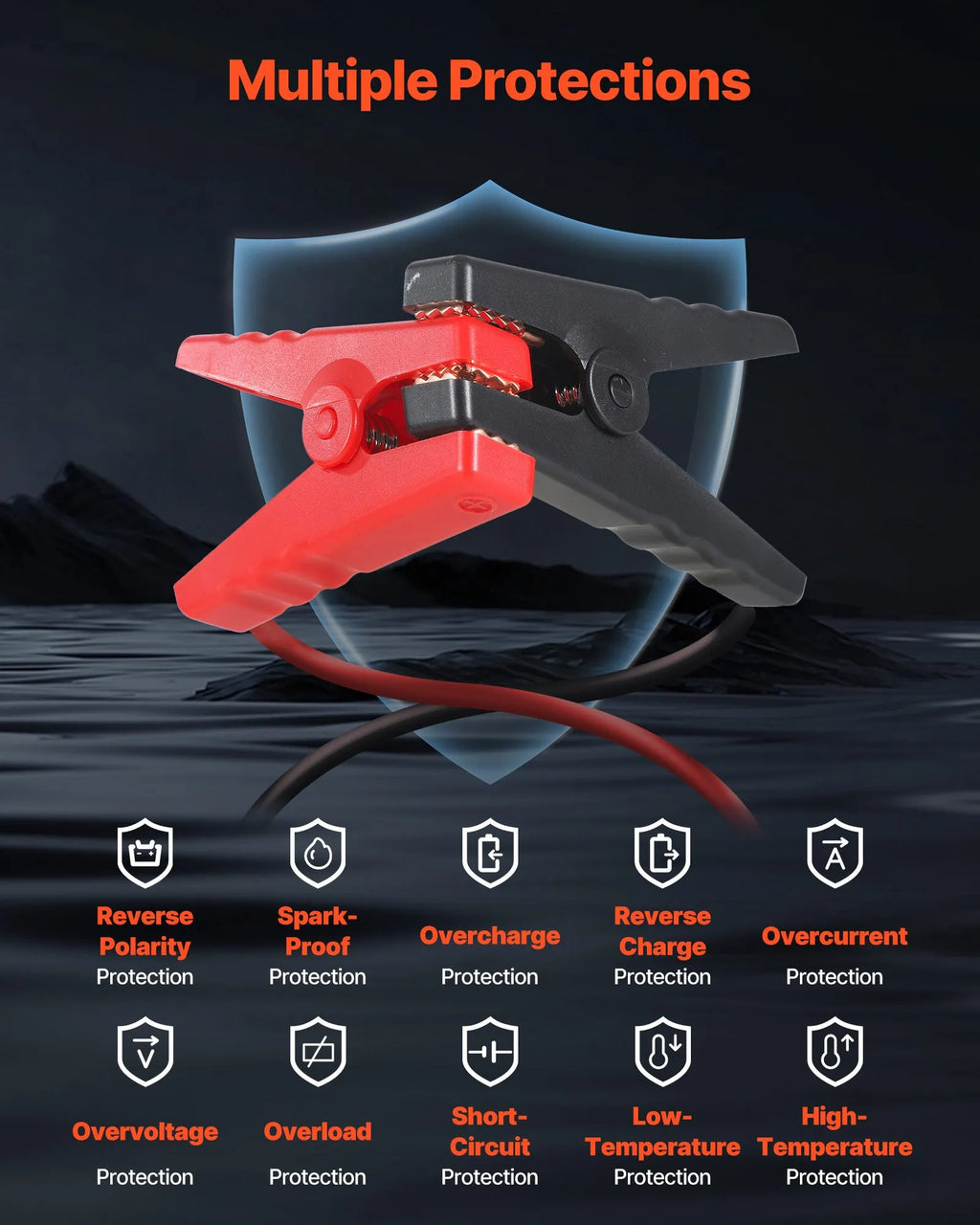 Uzlabota drošības aizsardzība: Ietver 12 aizsardzības funkcijas, tostarp pret nepareizu polaritāti, dzirkstelēm, pārlādēšanu, reverso uzlādi, pārstrāvu, pārspriegumu, pārslodzi, īssavienojumu, zemu vai augstu temperatūru u.c. Šis auto starteris nodrošina drošu lietošanu katru reizi.