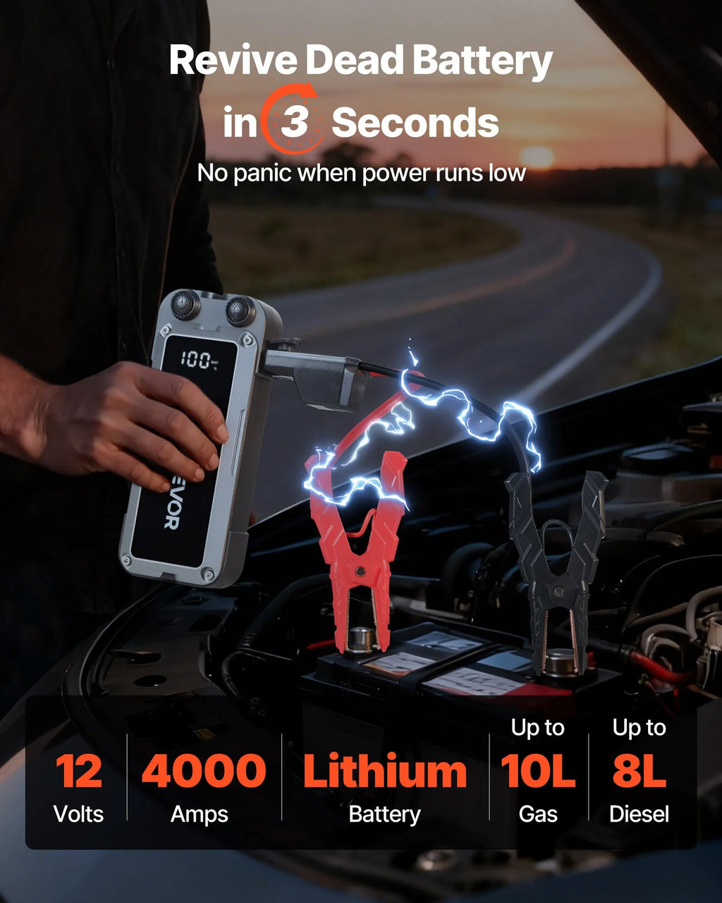 Ātra izlādēta akumulatora iedarbināšana: Aprīkots ar 4000 A maksimālo strāvu un 24 000 mAh litija akumulatoru, šis starteris viegli iedarbina benzīna dzinējus līdz 10 l vai dīzeļdzinējus līdz 8 l. Piemērots automašīnām, motocikliem, kravas auto, laivām un pat zāles pļāvējiem.