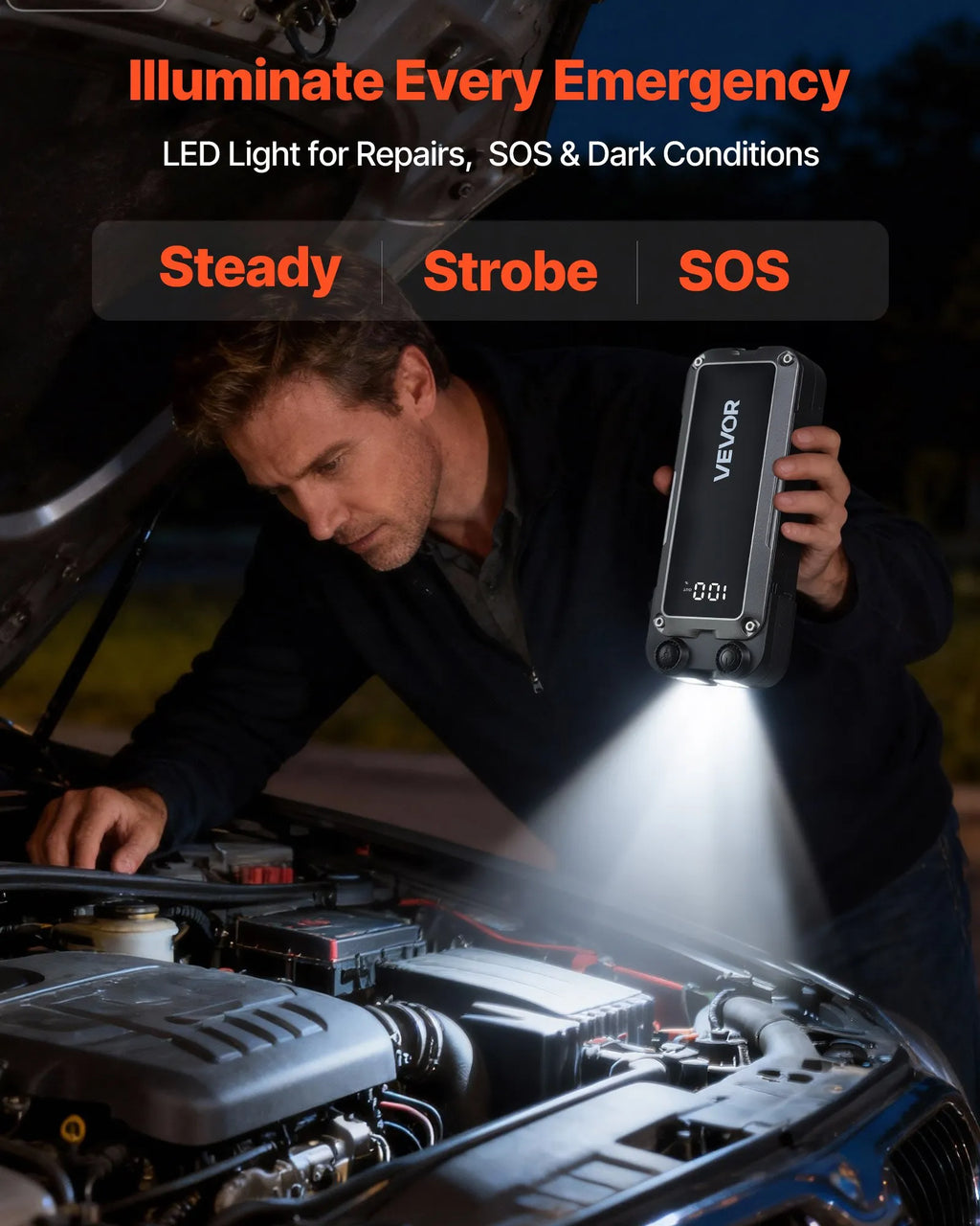 Aprīkots ar vairāku režīmu LED apgaismojumu (pastāvīgs, stroboskops un SOS), šis akumulatora iedarbināšanas starteris nodrošina spilgtu apgaismojumu ārkārtas situācijās. USB porti ļauj uzlādēt telefonus, planšetes un citas ierīces, palīdzot saglabāt savienojumu, kad akumulatora enerģija ir zema.