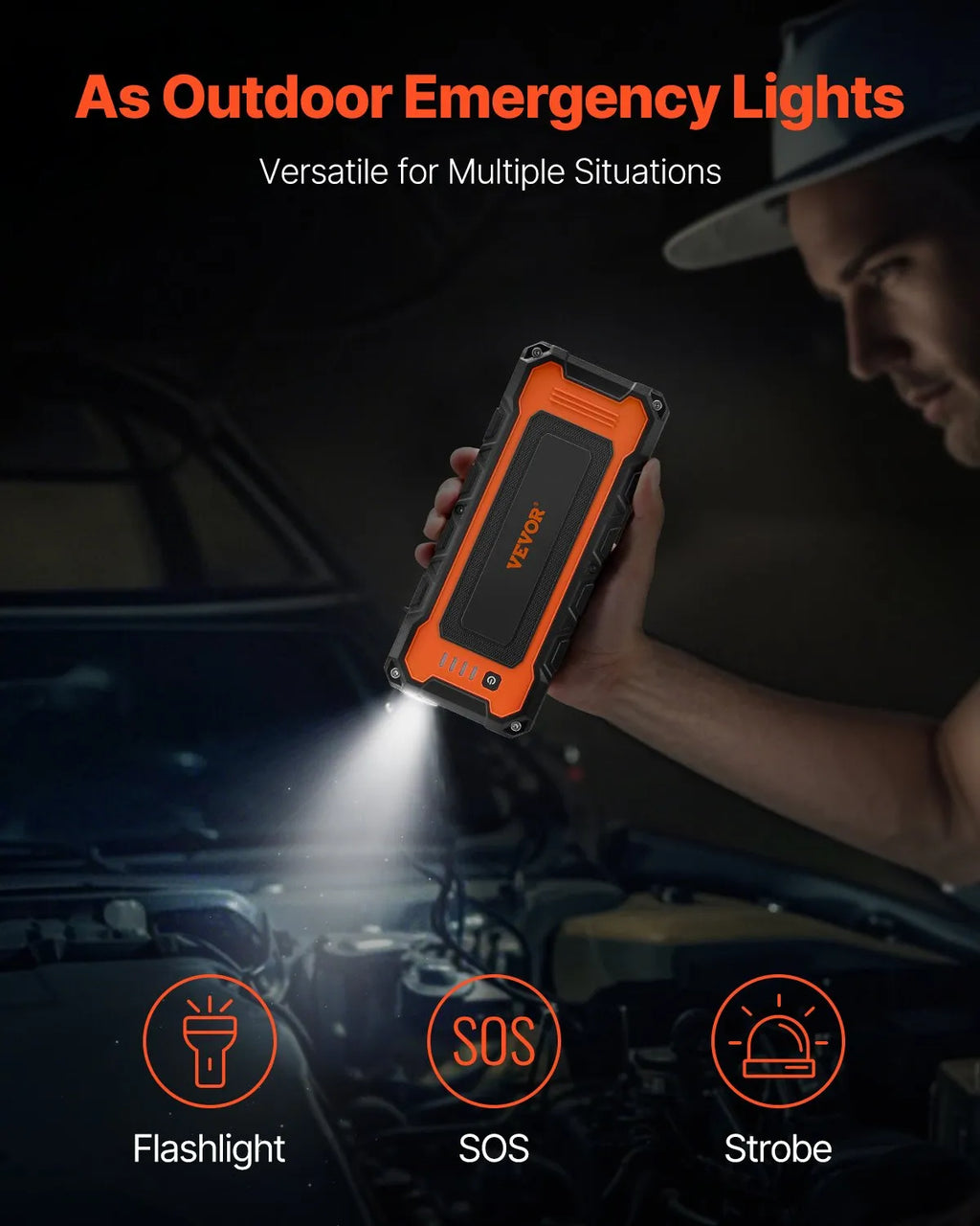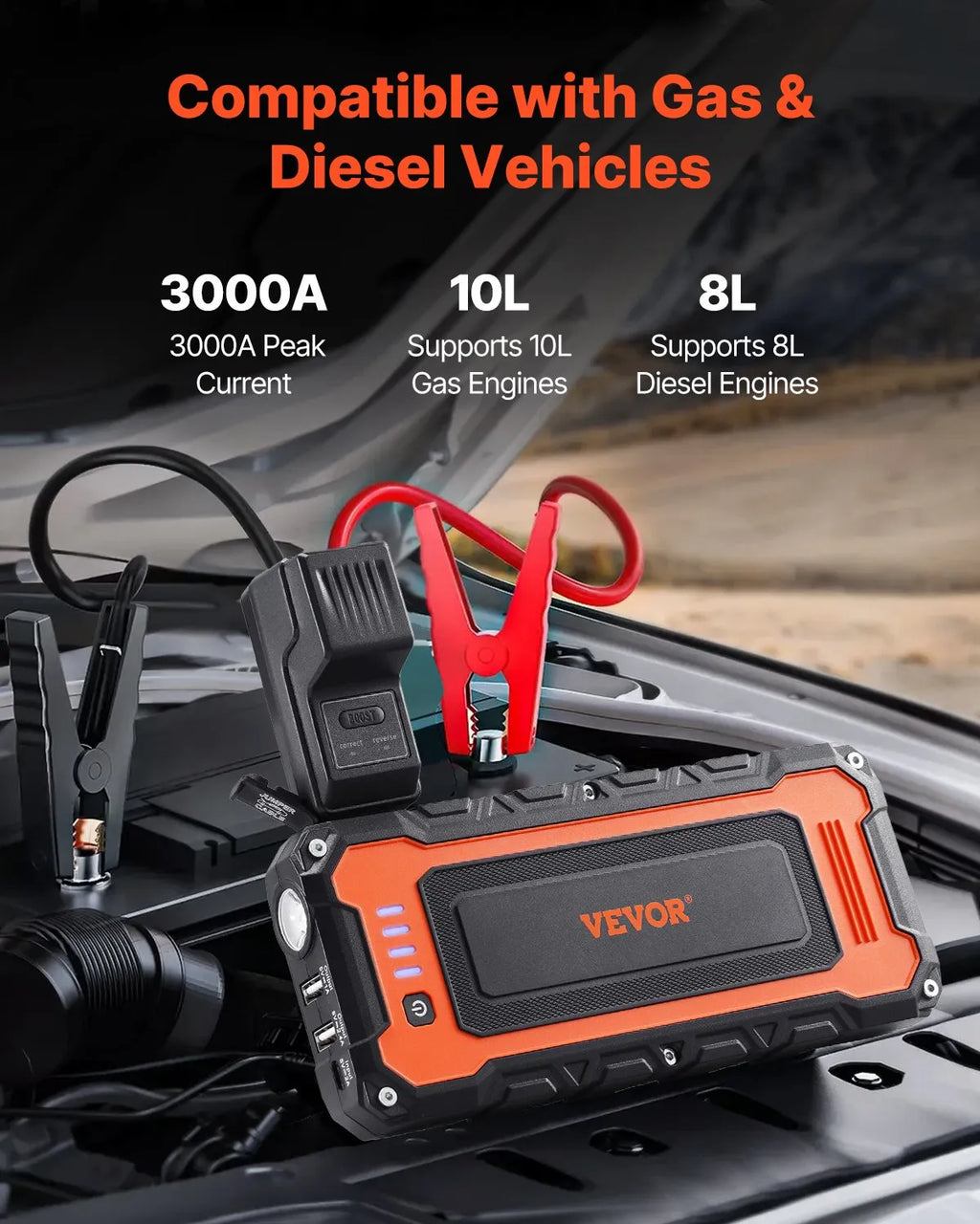 VEVOR automašīnas palaišanas ierīce , 3000 A starta strāva, 59,2 Wh litija akumulators, LED apgaismojums un palaišanas kabeļi, pārnēsājams starteris līdz 10 L benzīna un 8 L dīzeļdzinējiem