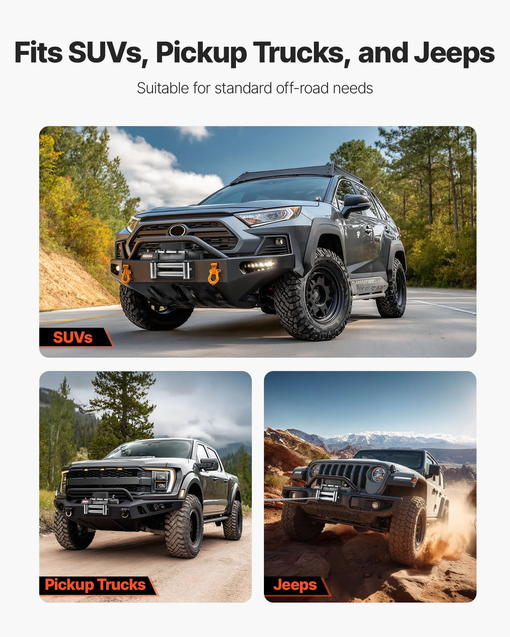 Universālais montāžas raksts ir piemērots lielākajai daļai SUV, pikapu un Jeep automašīnu. Glābšanas vinčas komplektā ietilpst virzošais rullis, āķis un strāvas kabeļi — gatavs ātrai uzstādīšanai un lietošanai