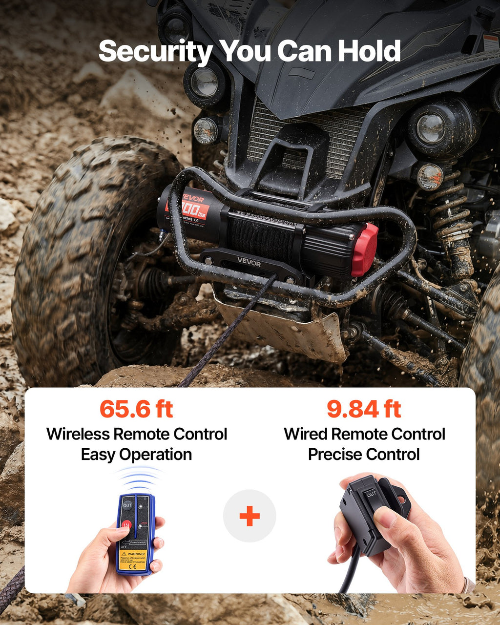 Elastīga vadība: Aprīkota ar bezvadu tālvadības pulti ar darbības attālumu līdz 20 m un vadu pulti ar 3 m kabeli precīzai kontrolei tuvumā. Šī 12 V vinča nodrošina precīzu darbību, ļaujot kontrolēt katru vilkšanas procesu.