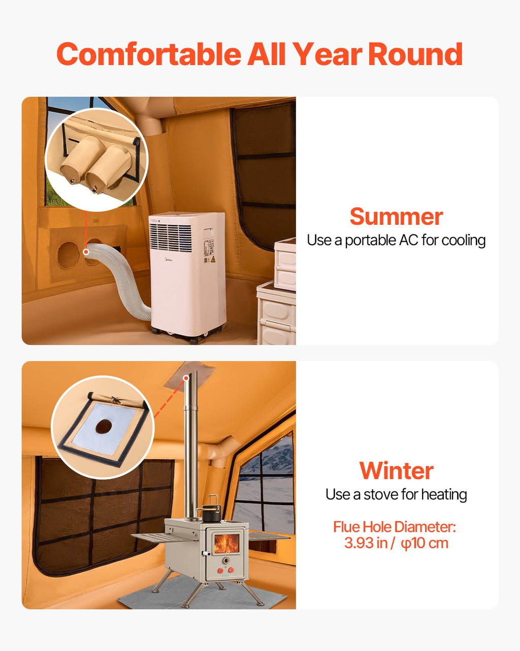 186 m² plaša iekšējā telpa: Šī piepūšamā kempinga telts piedāvā 186 m² lielu telpu (4,8 x 3,6 x 2,2 m), ērti uzņemot 8–12 personas. Komplektā ietilpst noņemami aizkari, lai izveidotu divistabu izkārtojumu vai plašu dzīvojamo zonu. Aprīkota ar krāsns cauruli un AC portu, šī telts ir ideāli piemērota visa gada lietošanai.