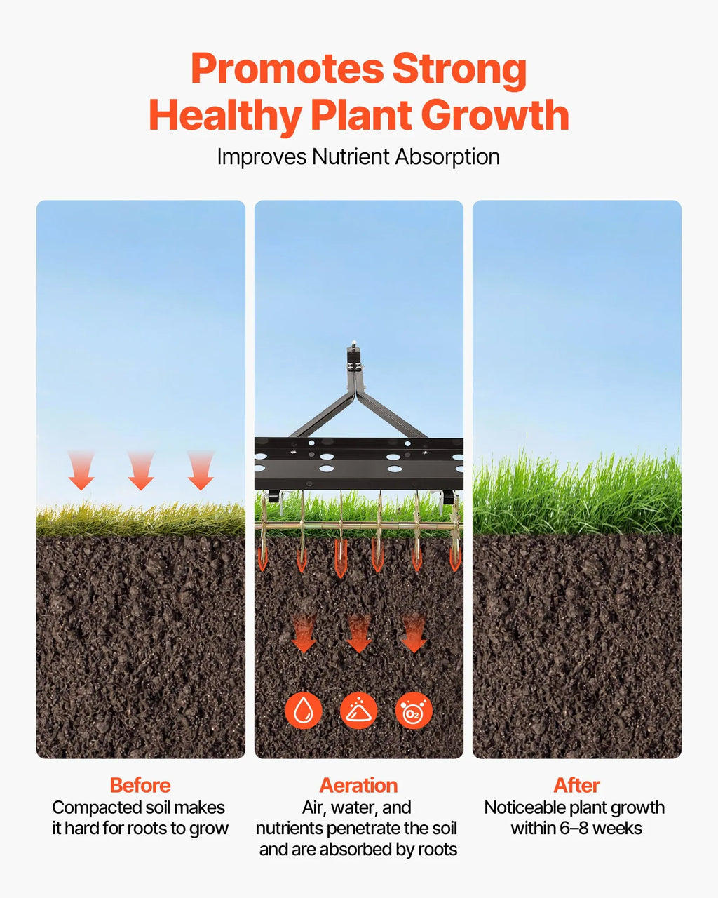 Sasniedz sakņu zonu: Aprīkots ar augstas izturības aerācijas tapām, kas iespiežas līdz 5 cm dziļumā, šis velkamais aerators efektīvi irdina sablīvētu augsni. Piemērots sausai, cietai zemei, kā arī mālainām un smilšainām augsnēm.