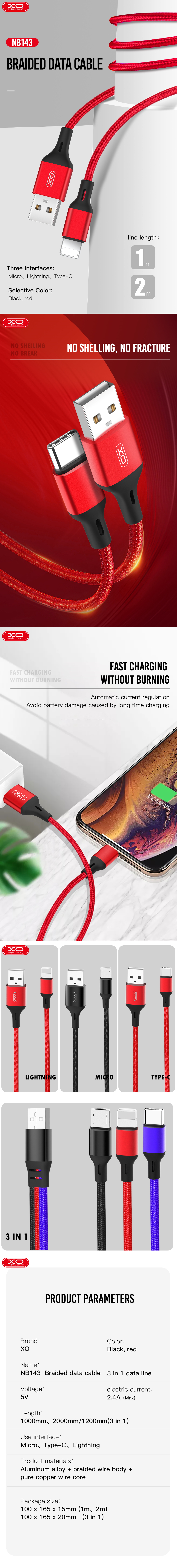 XO kabelis NB143 USB – microUSB 2,0 m 2,4 A, melns